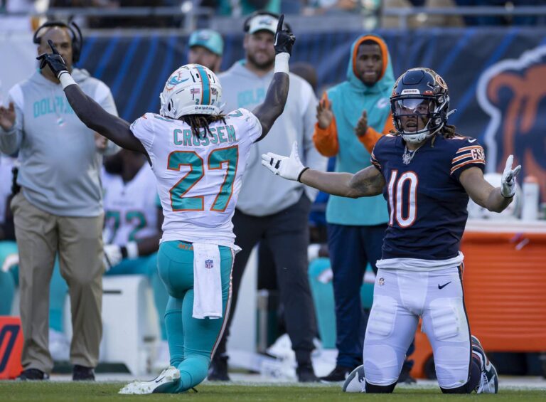 On the Bears’ second-to-last offensive play, wide receiver Chase Claypool went up to catch a deep shot from quarterback Justin Fields, but Dolphins cornerback Keion Crossen had his arms wrapped around Claypool from behind.
