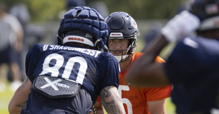 The Bears offense has had its share of issues over the first six practices as players get settled in new offensive coordinator Luke Getsy’s system. Those bumps behind starting quarterback Justin Fields continued into practice Tuesday, including in two-minute drills.