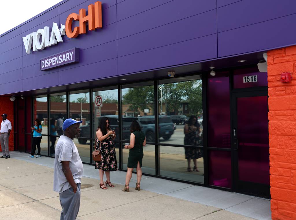 People gather outside of the new Viola Chi dispensary in Broadview for its soft opening on Aug. 2, 2023. (Stacey Wescott/Chicago Tribune)