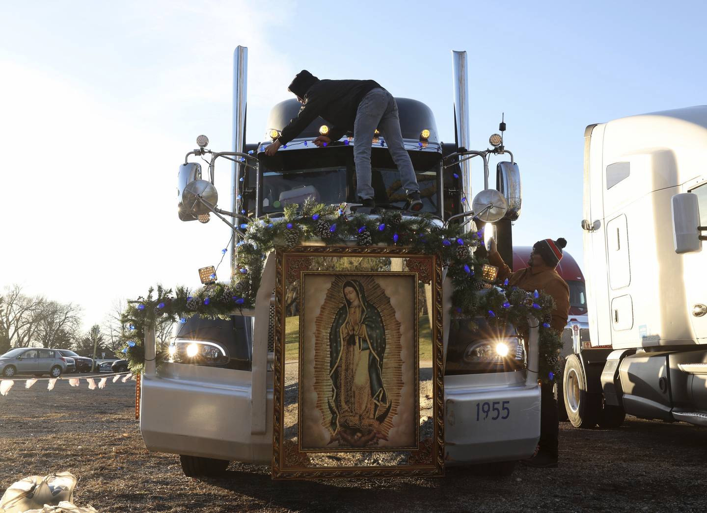 As a mariachi band played in a nearby parking lot, dozens of semitrailers parked one after the other on Western Avenue. Each one was adorned with images of Our Lady of Guadalupe, some with flags — Mexican and American ones. But instead of freight, this time the drivers transported only their families and friends.