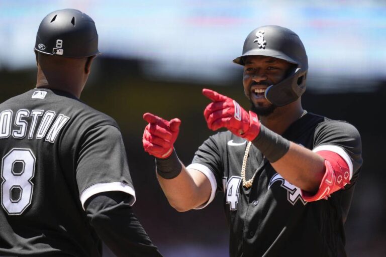 Chicago White Sox’s Eloy Jiménez celebrates after a two-RBI single during the third inning of a baseball game against the Los Angeles Angels on June 29, 2023. (Ashley Landis/AP)