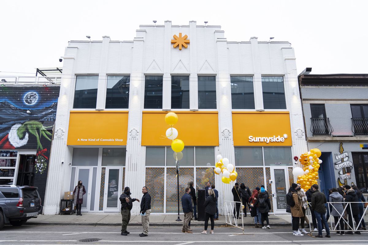 Tyrone Muhammad, executive director of Ex-Cons for Community and Social Change, left, talks with local resident Keith Fort, right, on April 12, 2021, in front of Sunnyside dispensary in the Lakeview neighborhood of Chicago. Muhammad and others in ECCSC hosted a demonstration against big money dispensaries muscling out would-be minority owners outside the dispensary. (Raquel Zaldivar / Chicago Tribune)
