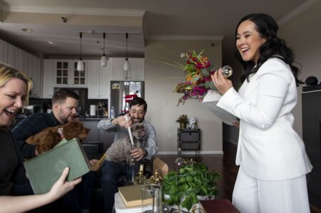 Bride and groom Courtney Lee and Alex Garcia wear smiles on their faces as their wedding planner Diane Brisk shows them the way to their wedding reception spot at the Rookery Building on LaSalle Street in downtown Chicago on April 9, 2022. (Chris Sweda / Chicago Tribune)