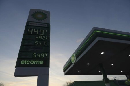 Fuel prices are displayed as motorists line up for free gas at the BP station at Pulaski Road and Montrose Avenue on Thursday, March 17, 2022 in Chicago. The Labor Department said Tuesday its consumer price index jumped 8.5% in March from 12 months earlier, with gas and food prices serving as drivers. (Jose M. Osorio / Chicago Tribune)
