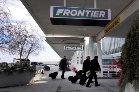 Passengers arrive for flights on Frontier Airlines at O’Hare International Airport on Feb. 7, 2022, in Chicago. Frontier has announced a merger with Spirit Airlines, creating what will become the fifth-largest airline in the United States. (Scott Olson / Getty Images)
