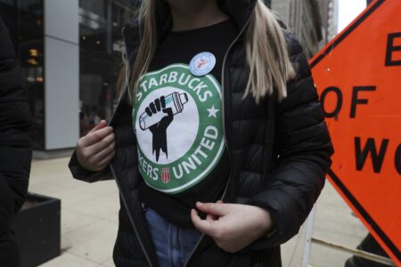 Starbucks worker Rachel Simandl, center, with fellow workers Logan Higgins, from left, Fernando Vargas-Soto, Maria Fantozzi, and Kaylie McKinley, outside a location in the 100 block of North Wabash Avenue April 7, 2022, in Chicago. Simandl, who works at a location in the Edgewater Beach neighborhood, has helped file for a union election. (John J. Kim / Chicago Tribune)