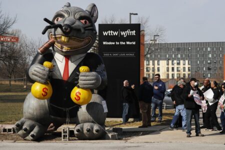 Members of IBEW (International Brotherhood of Electrical Workers) Local 1220 hold a strike event outside the WTTW studios in Chicago on Monday, March 21, 2022. Two dozen WTTW technicians, represented by IBEW, ended a three-week strike after agreeing to a new four-year labor contract Thursday afternoon with the Chicago public TV station. (Jose M. Osorio / Chicago Tribune)