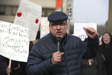 Dan Montgomery, president of the Illinois Federation of Teachers, speaks during a rally for striking Proviso High School District 209 teachers, counselors, social workers and librarians outside Proviso Mathematics and Science Academy March 4, 2022, in Forest Park. (Stacey Wescott / Chicago Tribune)