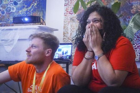 Angelika Maldonado, right, Amazon Labor Union (ALU) chairwoman of workers committee at Staten Island Amazon warehouse, and Brett Daniels, director of organizing for ALU workers committee, watch a zoom-cast of vote counting to unionize Amazon warehouse on Staten Island, N.Y., March 31, 2022, in New York. (Bebeto Matthews/AP)