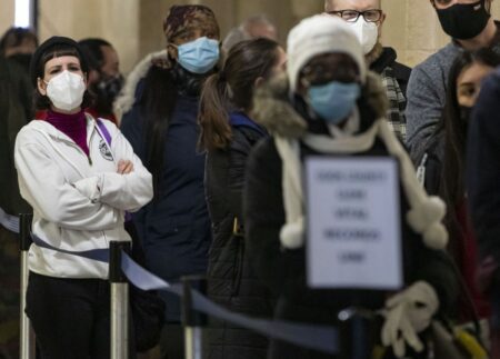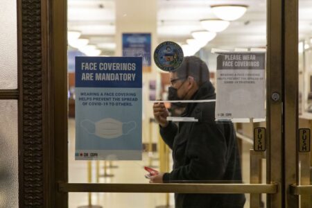 Dr. Allison Arwady, commissioner of the Chicago Department of Public Health, holds a face mask while speaking on Feb. 22, 2022, as the city announces it will be ending its indoor mask requirement in most locations on Feb. 28. (Brian Cassella / Chicago Tribune)