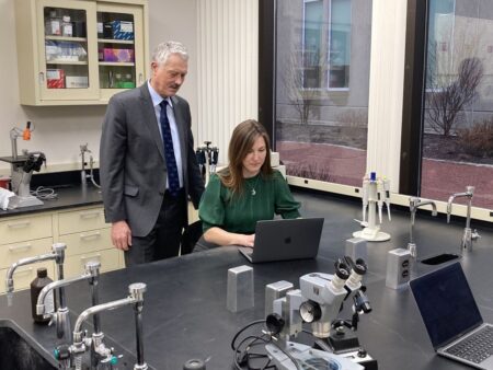 Talking about the Helix 51 business incubator at Rosalind Franklin University are, clockwise from left, Catherine Phillips, the CEO of TargaCell; Robin McWherter, TargaCell’s president; Claire Zhou, the COO of Everyplace Labs (partially hidden); Iyad Ayoub, the COO of Resuscitation Therapeutics, Inc.; Michael Rosen, the incubator’s managing director; Peter Farmakis, the CEO of Covira Surgical; Yekaterina Galat, the COO and co-founder of Artec Biotech, Inc., Vasil Galat, the CEO and the other co-founder of Artec. (Steve Sadin / Lake County News-Sun)