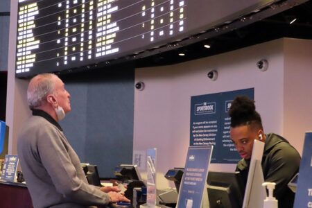A man places a bet at the sportsbook at the Ocean Casino Resort, on Thursday, Feb. 10, 2022, in Atlantic City, N.J. The American Gaming Association estimates more than 31 million Americans will bet on this year’s Super Bowl NFL football game. (Wayne Parry/AP)