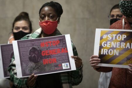Rachel Patterson, nature and healing coordinator for the Southeast Environmental Taskforce, attends a press conference denouncing the proposal to replace a shuttered scrap shredder on the North Side with a similar facility on the South Side. (Erin Hooley / Chicago Tribune)