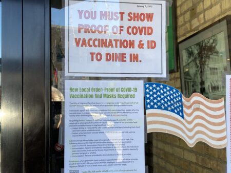 Manager Junella Hutchison checks vaccine cards as diners arrive during brunch at Daley’s restaurant in Woodlawn on Jan. 9. The proof-of-vaccine rule could be in place longer than the city’s indoor mask mandate though neither date has been set. (Brian Cassella / Chicago Tribune)