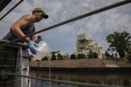 Ben Macuga, a biology researcher from the Indiana University Northwest, takes water samples from Burns Ditch at the Portage Lakefront and Riverwalk for testing on Aug. 21, 2019. The National Park Service closed the Portage Lakefront and Riverwalk beach areas and waters at Indiana Dunes National Park due to a chemical spill. (Zbigniew Bzdak / Chicago Tribune)