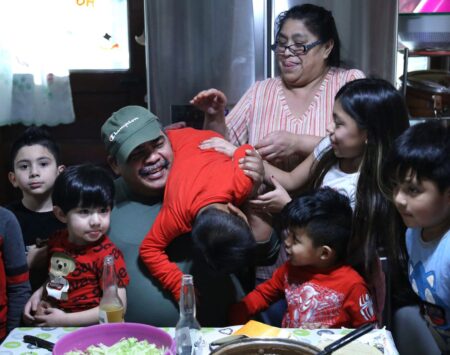 Francisco Arellano, center left, and his wife, Teresa, hang out with their grandchildren at a going-away party for the couple at their home in Chicago’s Brighton Park neighborhood on Jan. 14, 2022. The couple moved back to Maravatio, Michoacan state, in Mexico. (Chris Sweda / Chicago Tribune)
