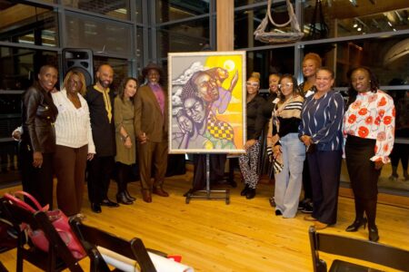Artist Larry “Poncho” Brown stands next to his commissioned work. (AFRO Photos / Reuben Greene) Event moderator Martha Reeves Jews, left, and celebrated artist Larry…