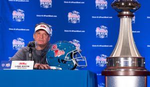 Ole Miss head coach Lane Kiffin speaks with the media ahead of the 2023 Chick-fil-A Peach Bowl, Friday, Dec. 29, 2023, in Atlanta, Ga. (Paul Abell via Abell Images for the Chick-fil-A Peach Bowl)