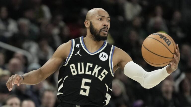 The Bucks’ Jevon Carter during the second half of a game against the Hornets on Jan. 31, 2023. (Morry Gash/AP)