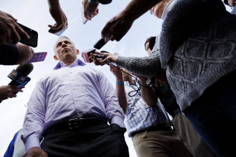 Cubs President Jed Hoyer talks with media members before a game against the Mariners on Tuesday, April 11, 2023, at Wrigley Field. (Armando L. Sanchez / Chicago Tribune)