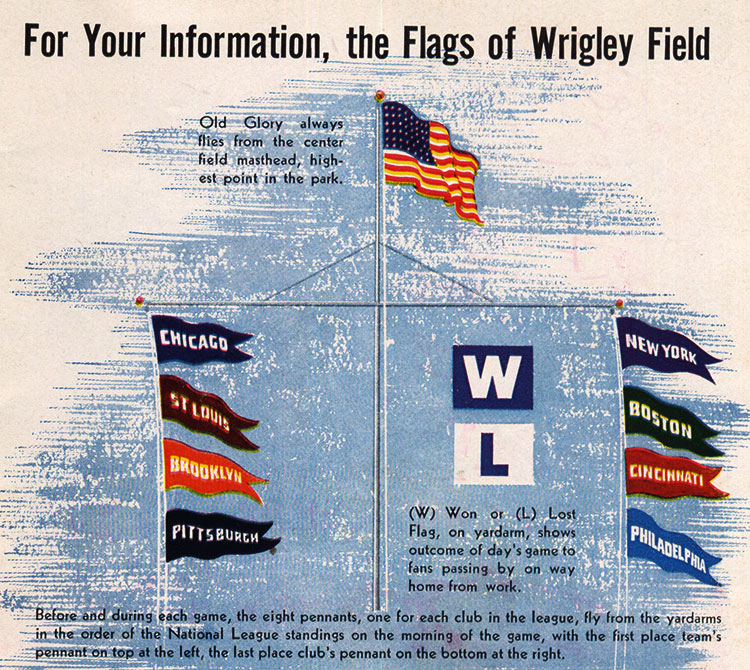 The won/loss flags were referenced in a 1946 Cubs program, says Todd Radom, a contributor on logos, design and visual history for Sporting News. He picked up the program on ebay, and penned a guide to Wrigley’s flags. Cubs historian Hartig adds, “That 1946 program is the only one with the Cubs W flag graphic.”