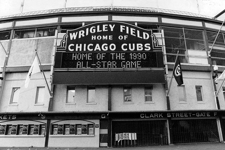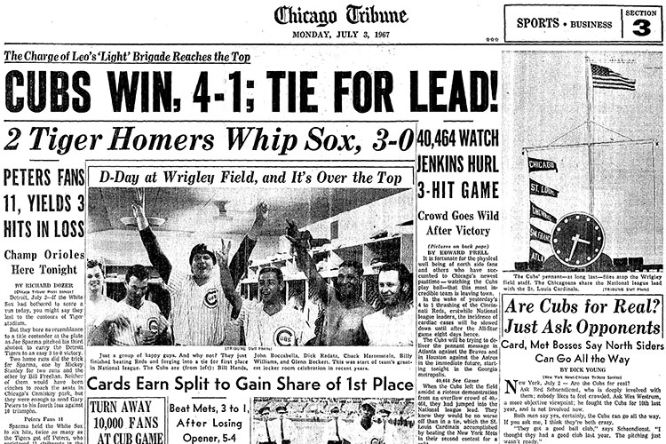 On July 2, 1967, the Cubs beat the Cincinnati Reds, 4-1, to tie with the St. Louis Cardinals to lead the National League. As Hartig recalls, some of the more than 40,000 fans on hand refused to leave until the Cubs’ flag was placed atop the league standings on the flagpole atop the center-field scoreboard. Later, the yardarm light signaled a Cubs win and the W flag was raised.
