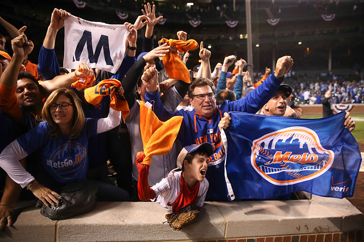 With a win at Wrigley Field on Oct. 20, 2015, the New York Mets swept the Cubs in the National League Championship Series. Mets fans turned their W flag rally towels upside down to celebrate.