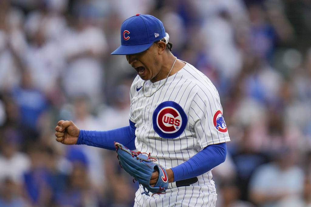 Cubs closer Adbert Alzolay celebrates after striking out Cardinals left fielder Tyler O’Neill to end the game Saturday at Wrigley Field. The Cubs won 8-6. (Erin Hooley/AP)