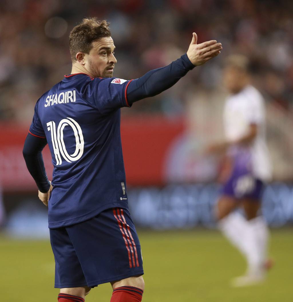 Chicago Fire midfielder Xherdan Shaqiri gestures in the second half of the Fire’s home opener against Orlando City at Soldier Field on March 5, 2022. (Chris Sweda / Chicago Tribune)