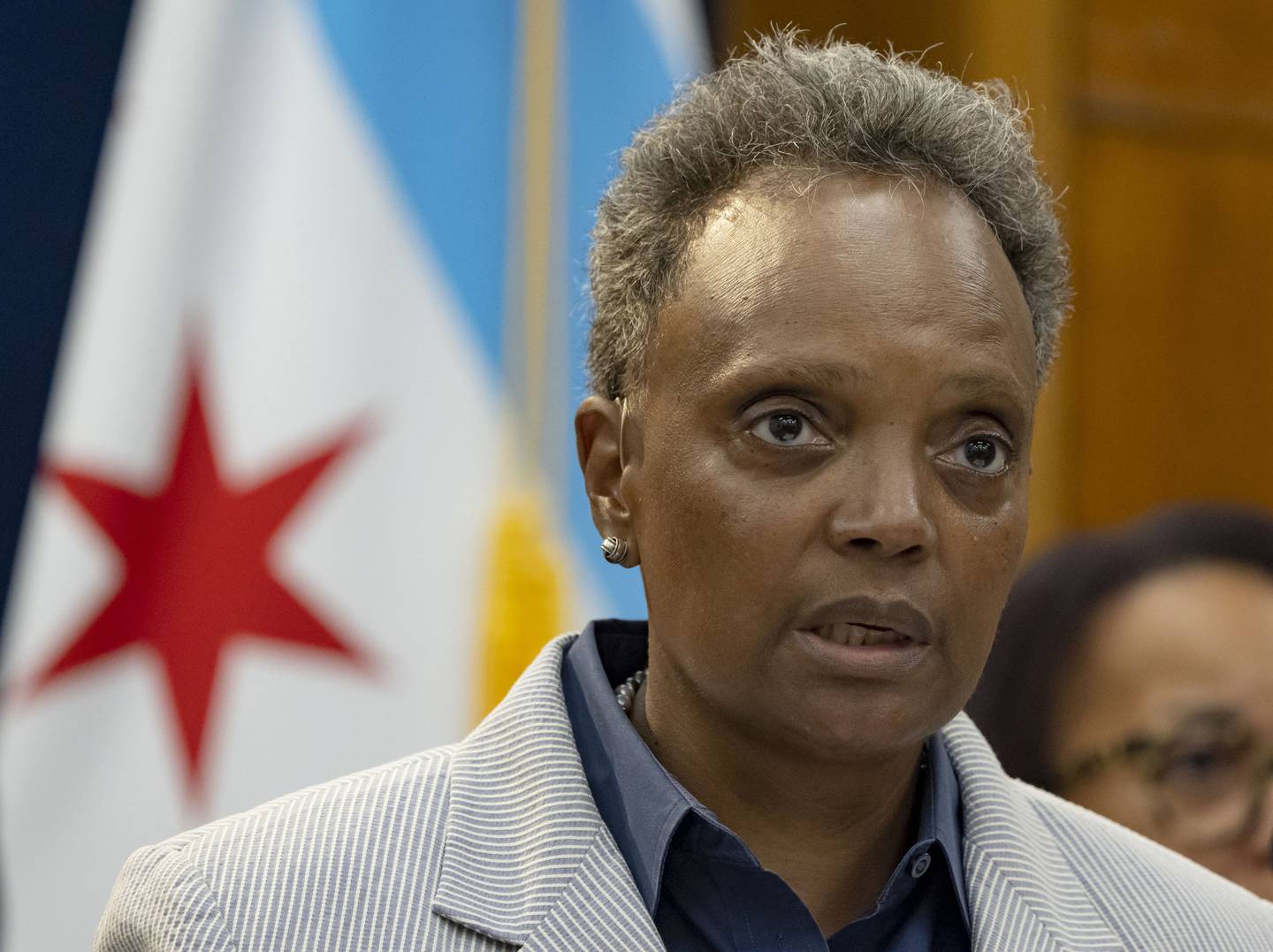 Mayor Lori Lightfoot announces the interim members of the Community Commission for Public Safety and Accountability on Aug. 29, 2022, at City Hall. (Brian Cassella / Chicago Tribune)