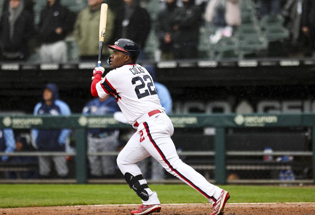 White Sox right fielder Oscar Colas hits a sacrifice fly in the ninth inning against the Rays on April 30 at Guaranteed Rate Field. (Eileen T. Meslar / Chicago Tribune)