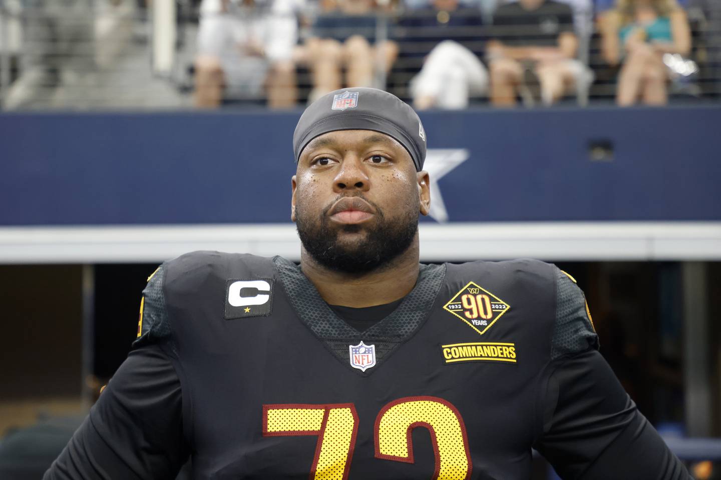 Commanders left tackle Charles Leno Jr. watches from the sideline during a game against the Cowboys on Oct. 2 in Arlington, Texas. (Michael Ainsworth/AP)