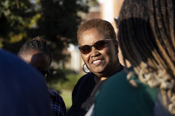 Cook County Clerk Karen Yarbrough goes door to door as she campaigns with Gov. J.B. Pritzker and Bellwood Mayor Andre Harvey on Nov. 1, 2022, in Bellwood. (Erin Hooley/Chicago Tribune)