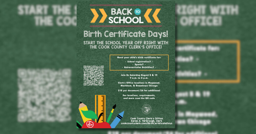 The Cook County Clerk’s Office will be hosting Back-to-School Birth Certificate Days on Saturday, August 5, and Saturday, August 19, from 9 a.m. to 2 p.m. at Clerk’s Office locations in Markham, Maywood, and downtown Chicago.