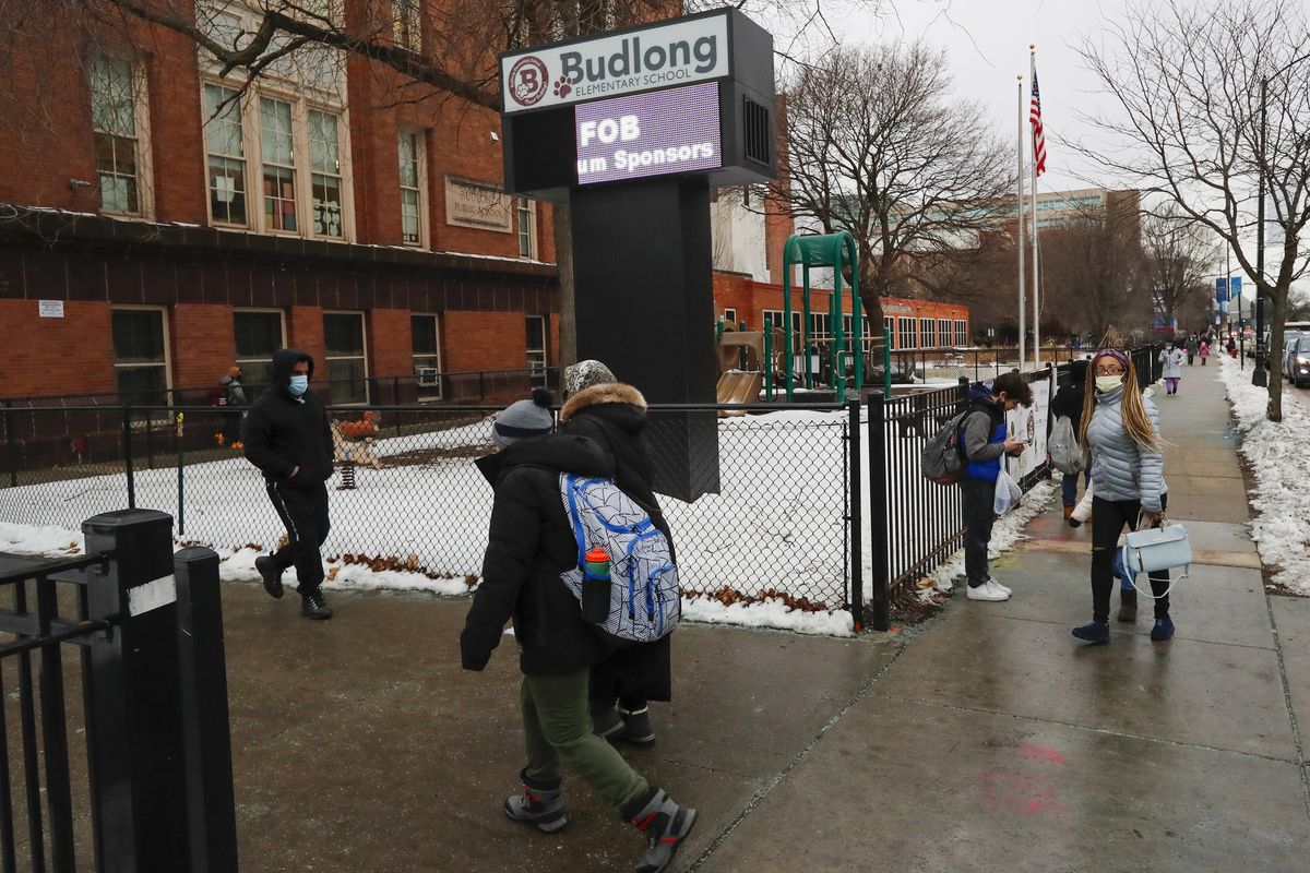 At Laurel Hill Elementary School in Hanover Park, music teacher Lynne Schefke, who normally works at Huff Elementary School in Elgin, dismisses her students after substitute teaching in a dual language kindergarten classroom on Jan. 4, 2022. A surge of COVID-19 cases forced Elgin-based Unit School District 46 to close five of its 57 schools due to staffing shortages, including Huff Elementary. (Chicago Tribune)