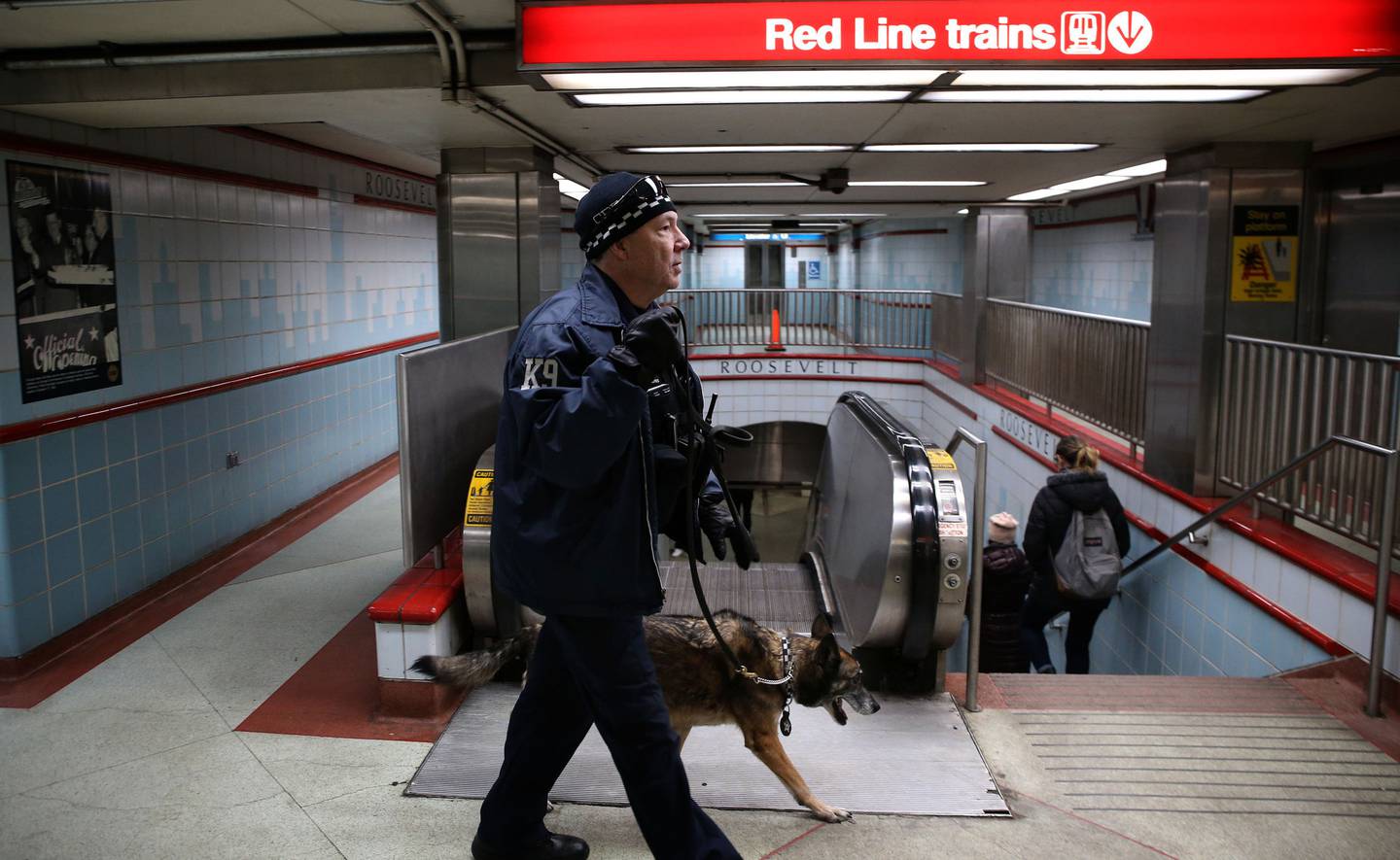 A K-9 police officer and his dog patrol the station at State Street near Roosevelt Road in Chicago on Feb. 28, 2020. (Antonio Perez / Chicago Tribune)