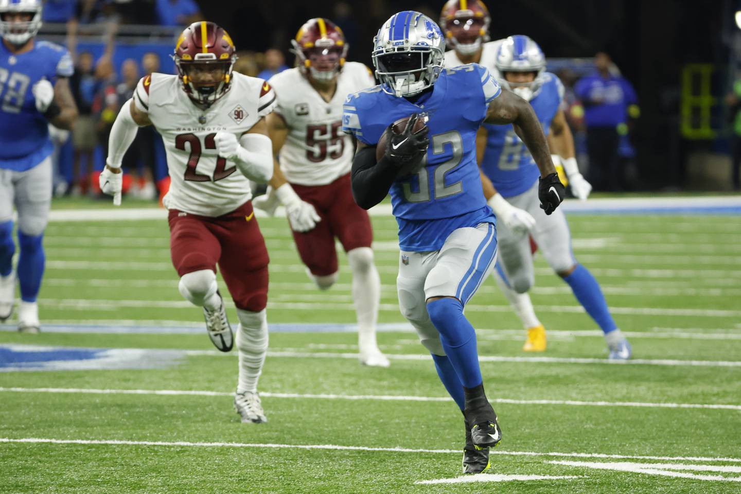 Aidan Hutchinson, the No. 2 pick in this year’s NFL draft, had three sacks in the first half to help the Lions (1-1) lead 22-0 at halftime. Will Harris had an interception in the second half to stunt the Commanders (1-1) as they tried to rally.