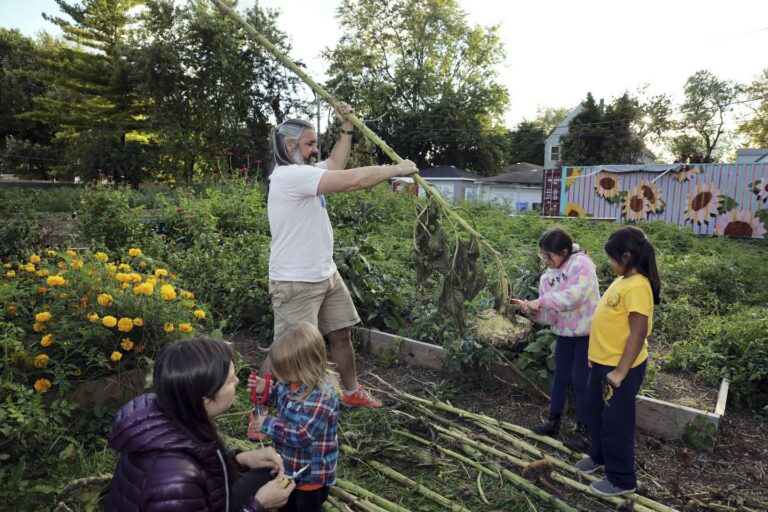America Ortega, center, helps gather material to make pollinator nests at Star Farm on South Laflin Street in Chicago on Sept. 28, 2022. (Terrence Antonio James / Chicago Tribune)