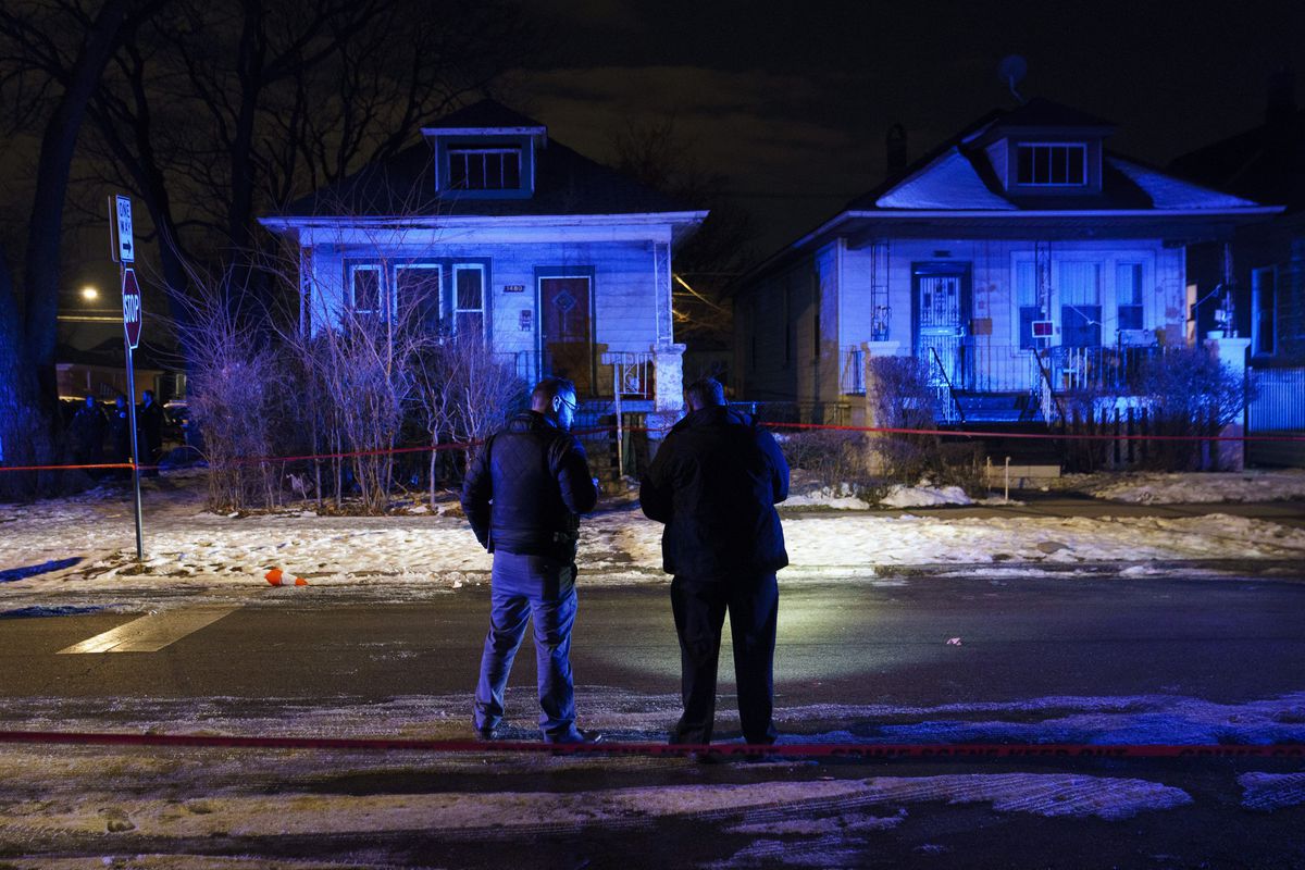 Officers work the scene where a 14-year-old boy was shot in the head near the 1400 block of West 73rd Street in the Englewood neighborhood Wednesday Jan. 12, 2022 in Chicago. Earlier in the day a 14-year-old boy was fatally shot on the street on 2200 block of West Adams nearly half a mile from the United Center. (Armando L. Sanchez / Chicago Tribune)