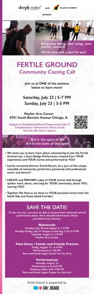 Don’t forget to RSVP and join us this weekend at the Fertile Ground: Community Casting Call, a FREE event with information on joining the volunteer cast of Fertile Ground, a community performance presented by Deeply Rooted Productions and Blacks in Green.