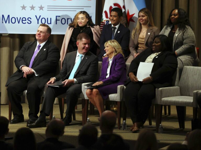 Greg Case, CEO of Aon, from left, U.S. Secretary of Labor Marty Walsh, first lady Jill Biden and Terionna Wilson, a reinsurance apprentice at Aon, attend an event to kick off National Apprenticeship Week and discuss Biden administration efforts to expand training and apprenticeship programs on Nov. 14, 2022. (Stacey Wescott / Chicago Tribune)