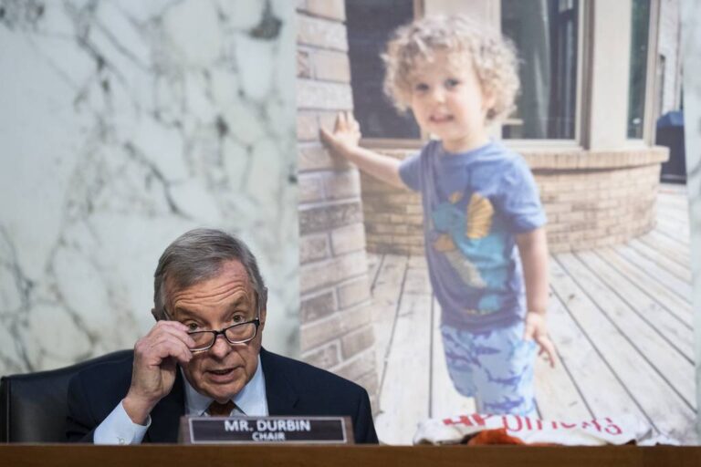Sen. Dick Durbin conducts the Senate Judiciary Committee hearing titled After the Highland Park Attack: Protecting Our Communities from Mass Shootings, in Hart Building on July 20, 2022. Behind him is a photo of Aiden McCarthy, 2, whose parents Irina and Kevin were killed in the Highland Park shooting. (Tom Williams/CQ-Roll Call)