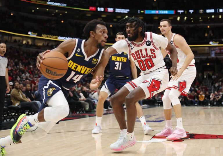 Bulls guard Javon Freeman-Liberty (00) defends Nuggets guard Ish Smith in a preseason game on Oct. 7, 2022, at the United Center. (John J. Kim/Chicago Tribune)