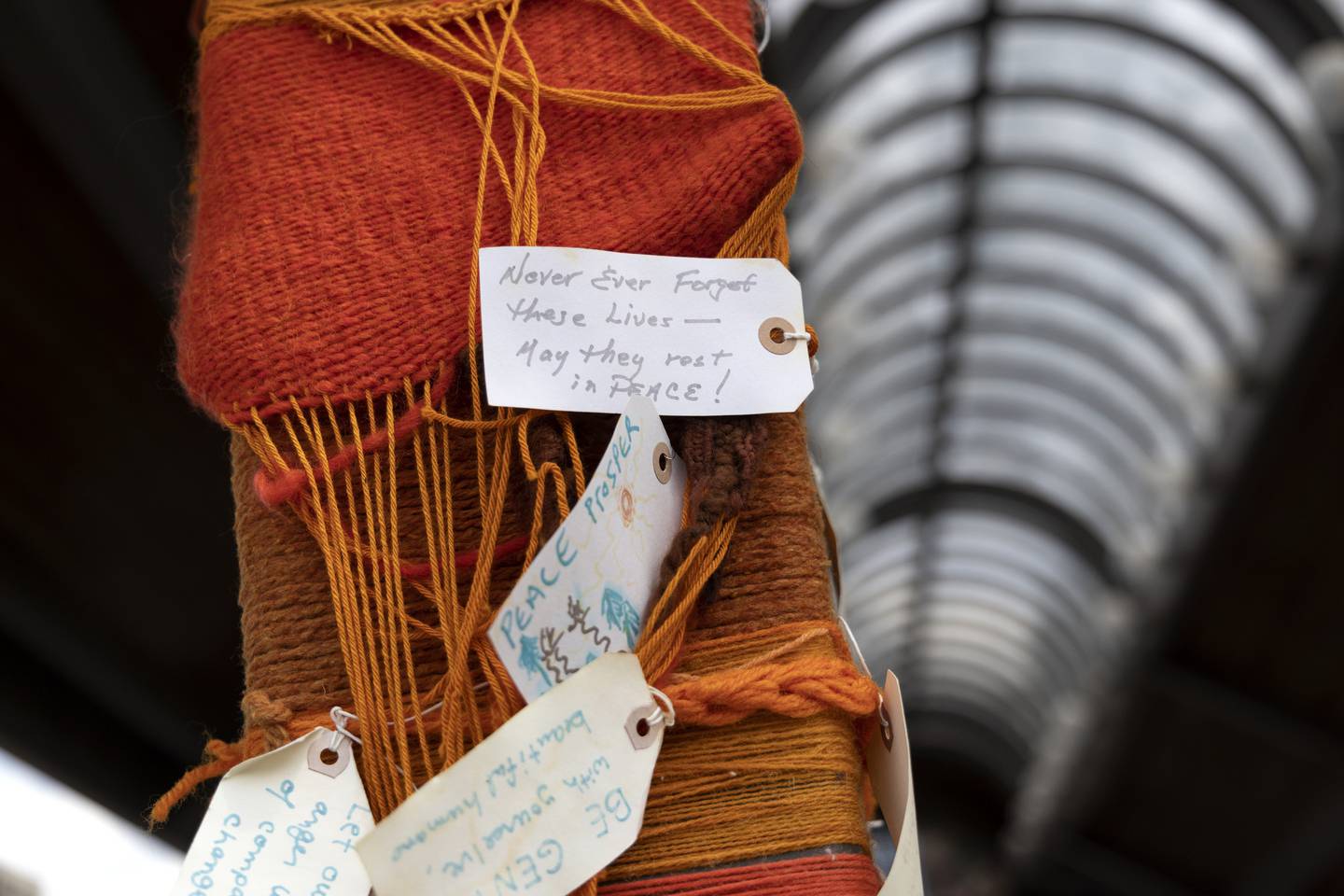 Artist Jacqueline von Edelberg has made a counterproposal regarding the installation, which builds on other projects she has done to protest gun violence and remember its victims. Residents and visitors have wrapped the pavilion pillars and numerous stones in orange yarn — the color adopted by anti-gun violence activists — and left thousands of messages on luggage tags.
