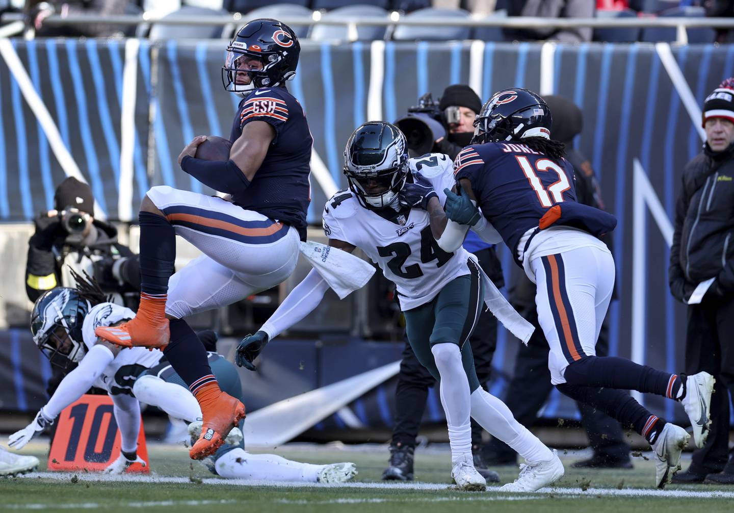 The Eagles did a pretty good job of beating Fields to the edge on running plays through 1½ quarters, holding him in check when he ran the ball or pulled it down to scramble. Then Fields spun out of a sack attempt by edge rusher Haason Reddick — who had two of the Eagles’ six sacks — and took off for a 39-yard gain down the Philadelphia sideline, narrowly stepping out of bounds at the 9-yard line.