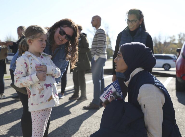Nabeela Syed, who ran for the 51st Illinois House District seat, campaigns outside an early voting location in Palatine on Oct. 29, 2022. (Trent Sprague/for the Chicago Tribune)