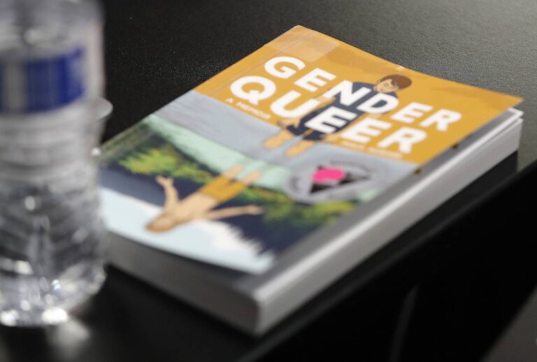 A copy of “Gender Queer,” a graphic novel about a nonbinary teen, sits on a table during the Barrington District 220 school board meeting on Aug. 16, 2022, in Barrington. (H. Rick Bamman / Pioneer Press)