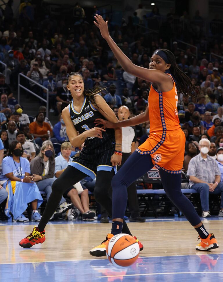 Chicago Sky forward Candace Parker passes the ball as Connecticut Sun forward Jonquel Jones defends in the first quarter in Game 1 of the WNBA semifinals at Wintrust Arena on Aug. 28, 2022. (John J. Kim/Chicago Tribune)