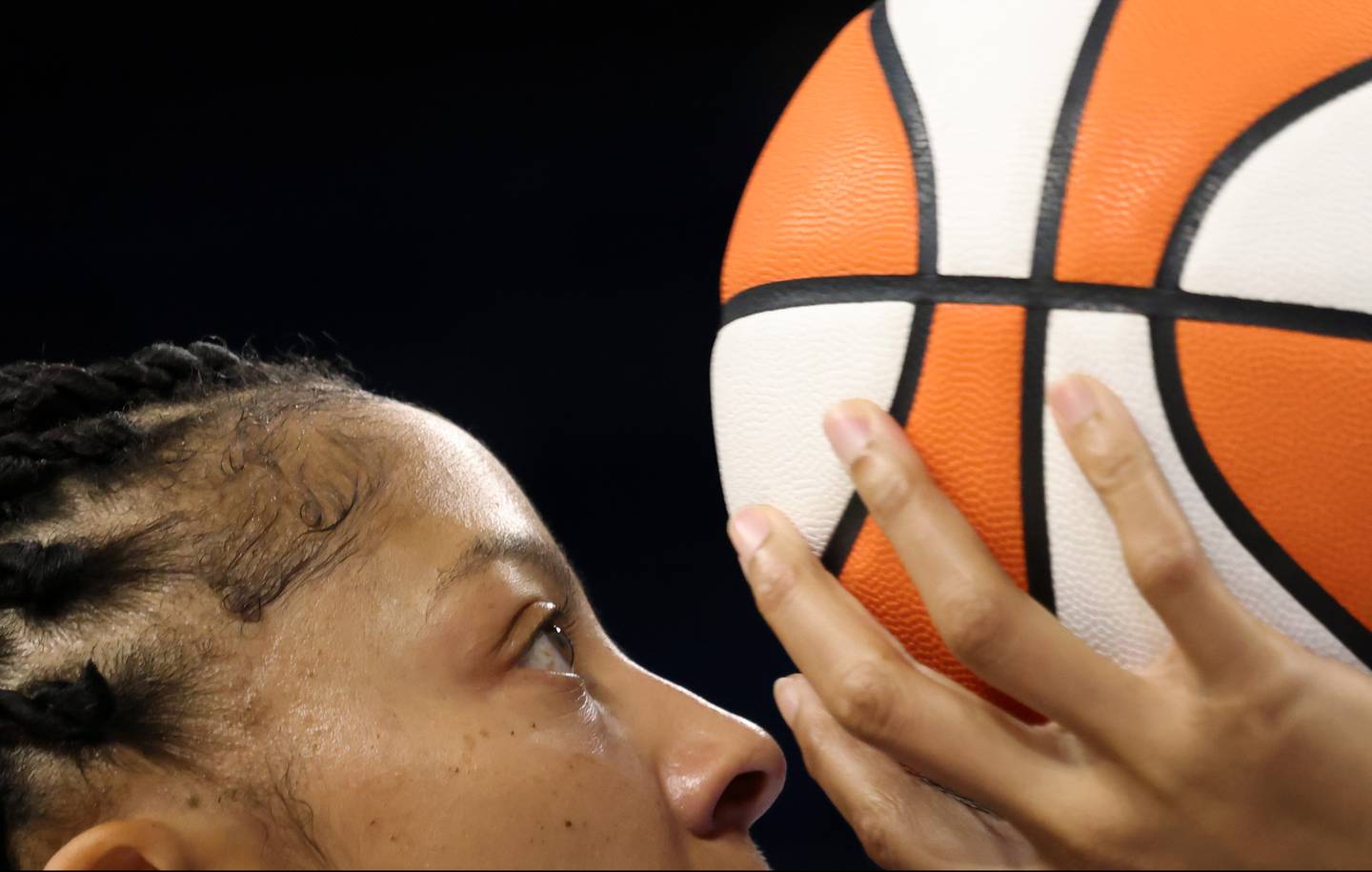 Sky forward Candace Parker warms up for Game 1 of the WNBA semifinals against the Connecticut Sun at Wintrust Arena on Aug. 28, 2022. (John J. Kim/Chicago Tribune)