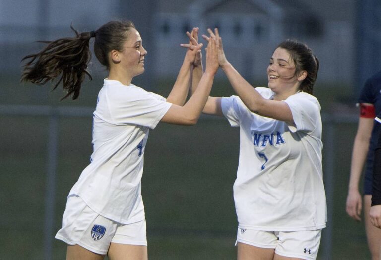 Geneva’s Alyssa Houk (4) celebrates her goal with Olivia Rawls (7) against Bartlett during a nonconference game in Bartlett on Monday, April 3, 2023. (Mark Black / The Beacon-News)